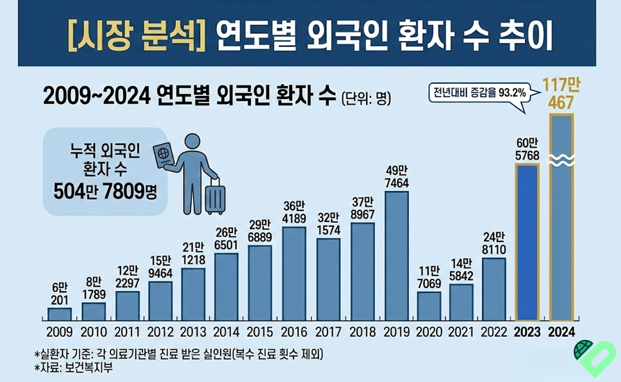 2025년 보건복지부 조사에 따르면 2024년 한국을 방문한 외국인 환자 수는 전년 대비 93.2% 증가하며 역대 최대치를 기록했습니다. 이 중 일본인 환자는 135% 증가하며 전체 국가 중 1위를 기록했습니다. 코로나 이후 한국 의료에 대한 신뢰가 회복되며 역대 최대치를 기록한 수치입니다.