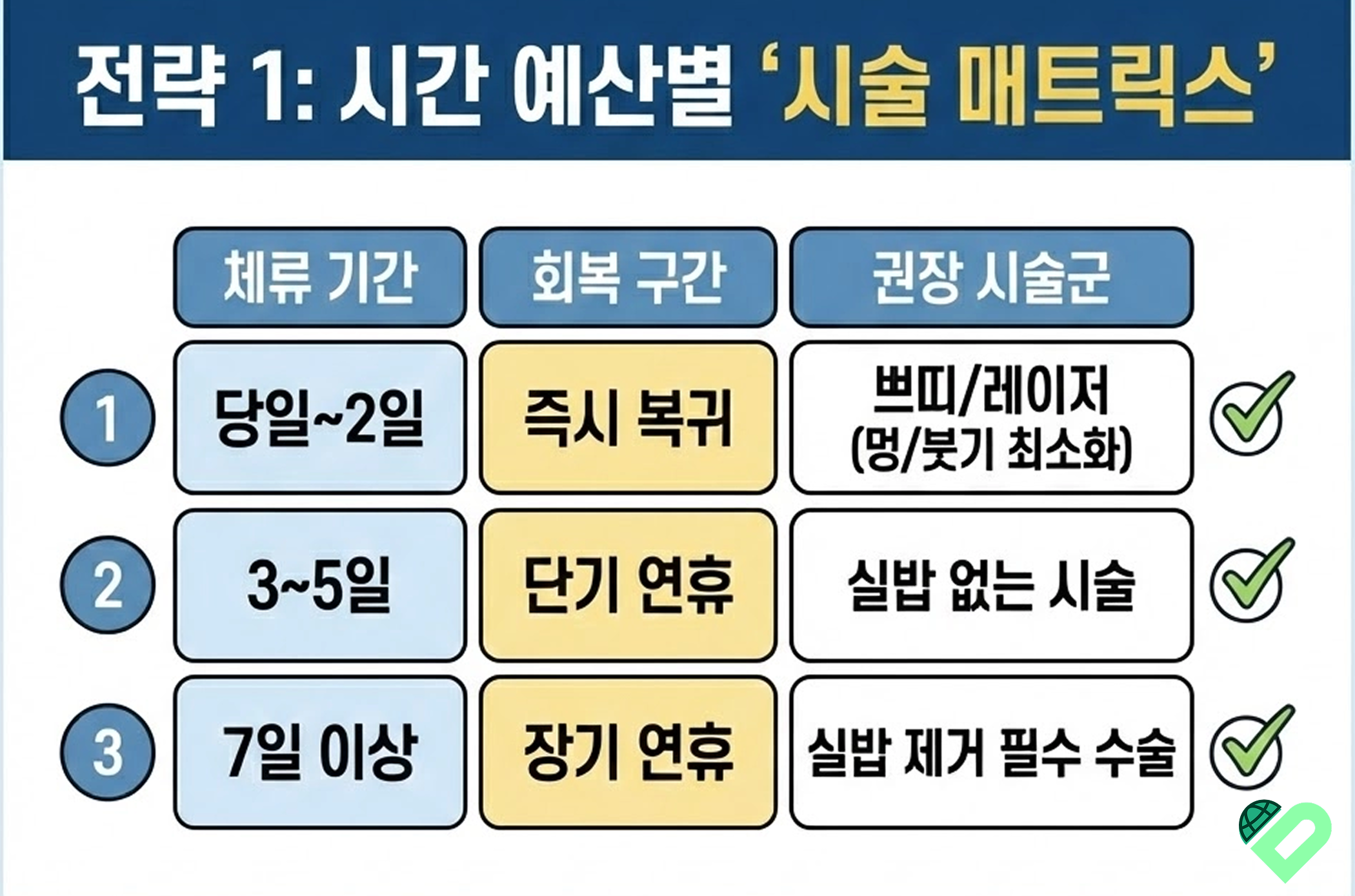 이유는 단순합니다. 연휴는 제한된 자원입니다. 회사 복귀가 걸린 일정에서 실패 비용이 큽니다. 그래서 병원 입장에서는 '효과'보다 먼저 복귀 가능성을 설득해야 합니다.