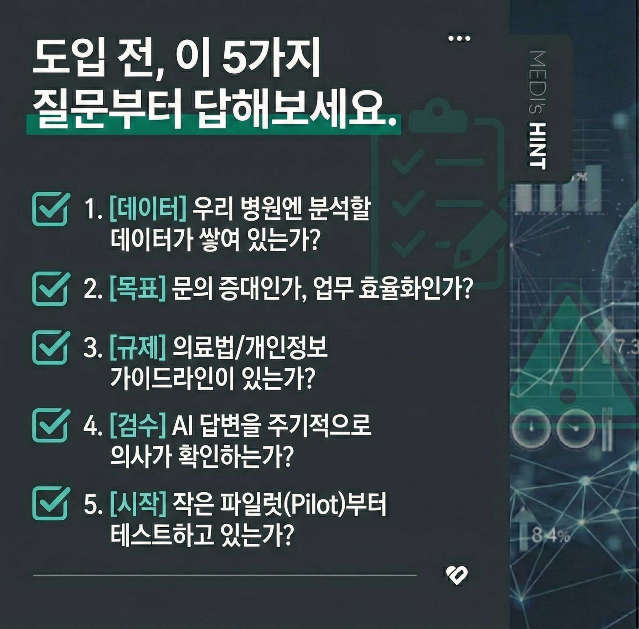 AI 도입을 고민하는 병원이 내부적으로 한 번쯤 스스로에게 던져보면 좋을 질문들을 정리해 보겠습니다.