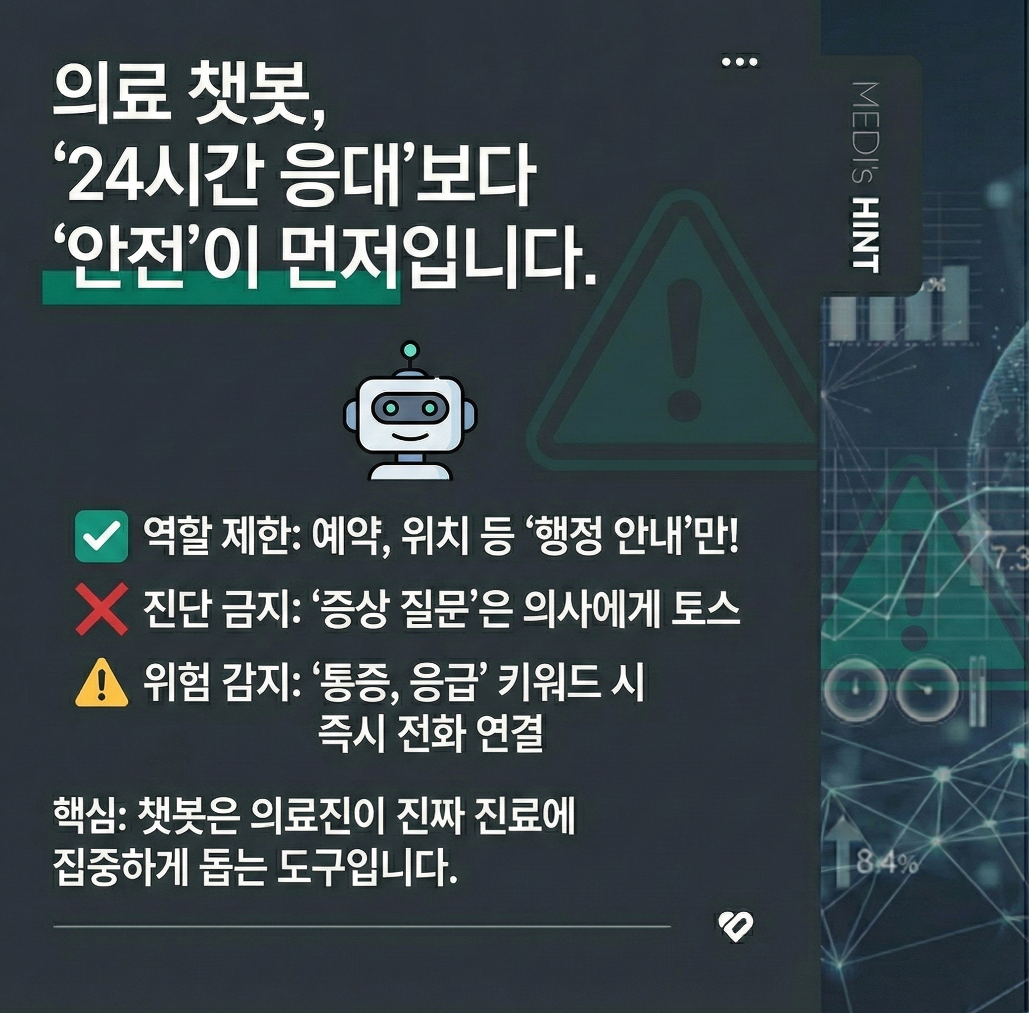 진단·치료 결정·약 처방에 해당하는 내용은 챗봇이 아니라 반드시 의료진이 맡도록 선을 긋는 것이 필요합니다.