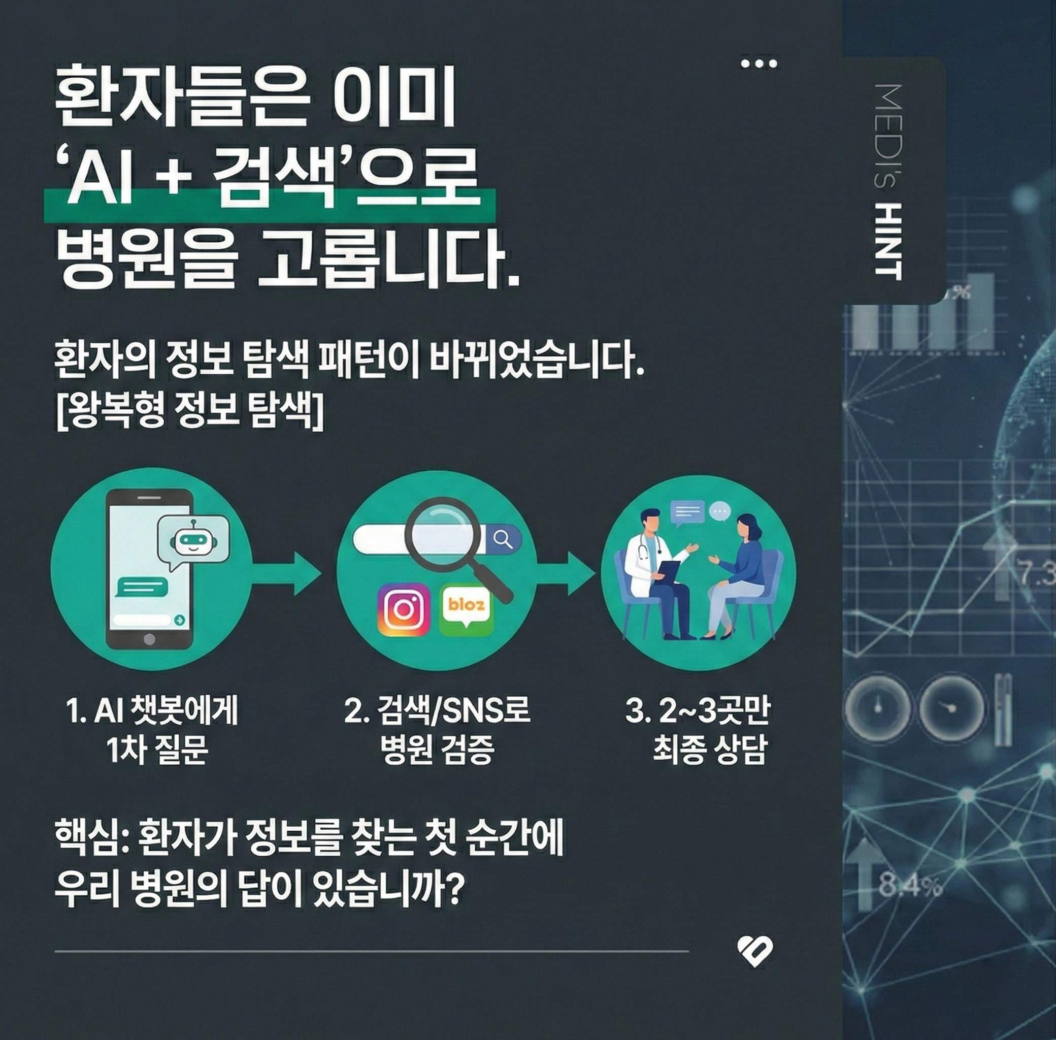 “어디에 광고를 더 뿌릴까?”보다 “환자가 정보를 찾기 시작하는 그 순간부터 우리 병원이 신뢰할 만한 답을 주고 있는가?”로 이동하고 있습니다.